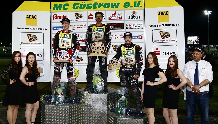 Michael Härtel, der vor zwei Jahren den Pfingstpokal gewann und gerade seine Abiturprüfungen absolviert hatte, zeigte sich wieder begeistert von der Veranstaltung. „Es war ein schönes Rennen, auch wenn es gar nicht so einfach war. Aber ich fahre sehr gern in Güstrow“ und für Kai Huckenbeck, der bei der Siegerehrung zuerst an den gestürzten Mikkel Bech dachte, ist das sowieso klar und daher konnte er die Zuschauer auch an seinen Gefühlen beim Auftritt in der polnischen Extraliga teilhaben lassen: „Es ist einfach grandios in der besten Liga der Welt am Start zu sein.“